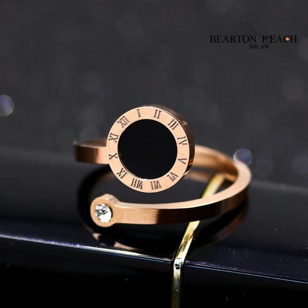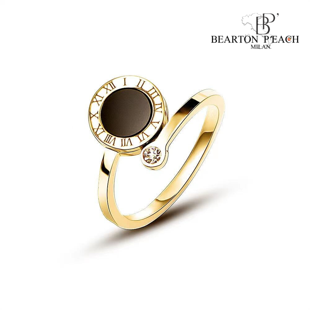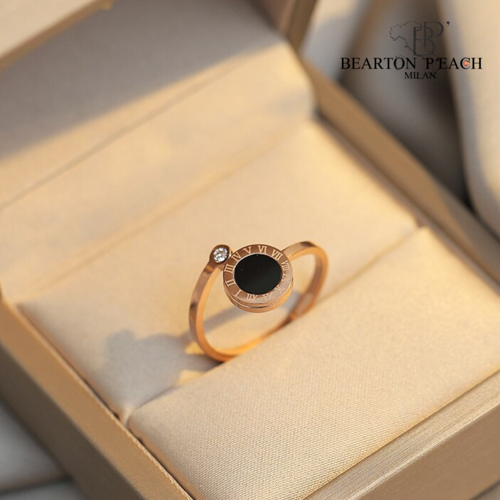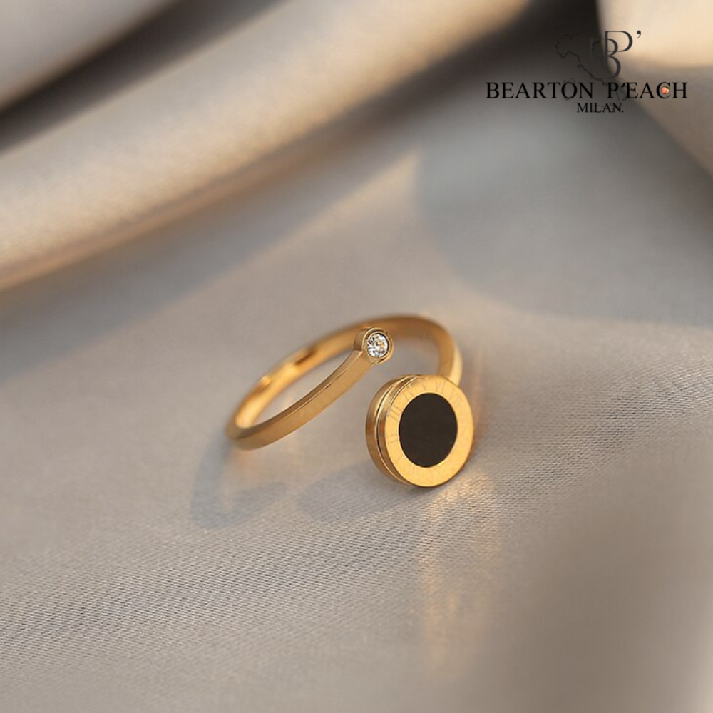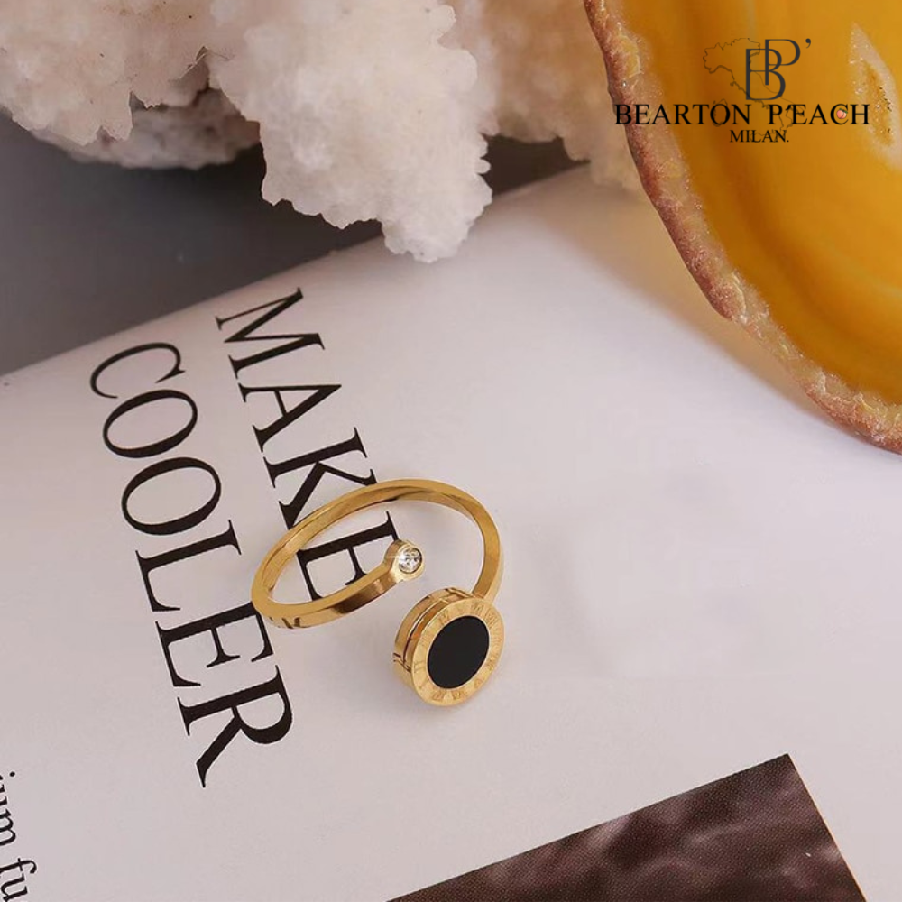 טבעת זהב אלגנטית משובצת יהלומים ואבן שחורה במרכז
