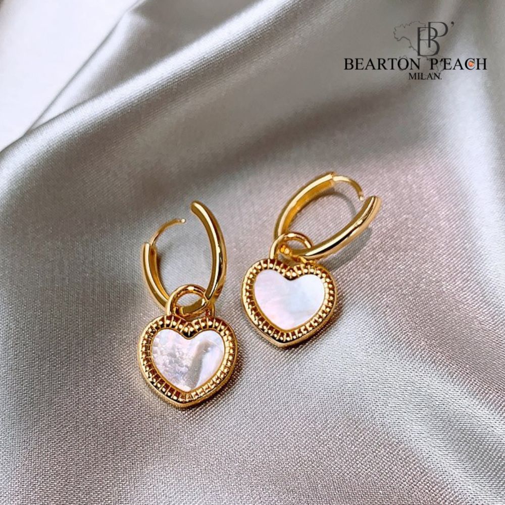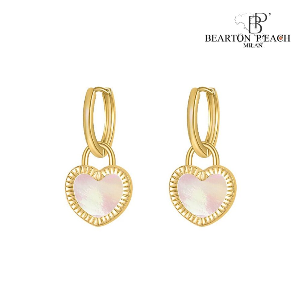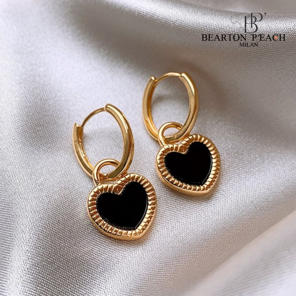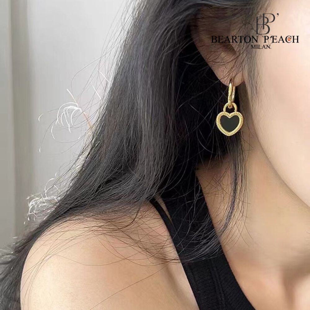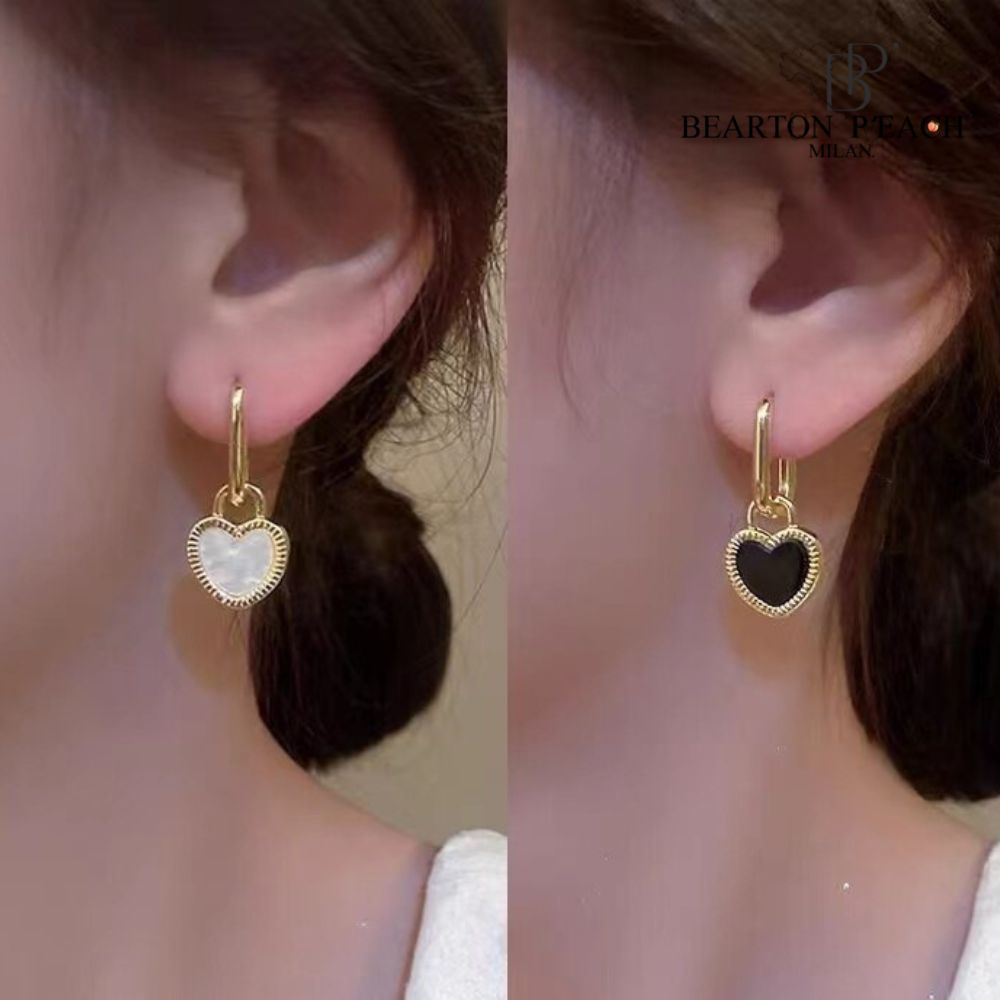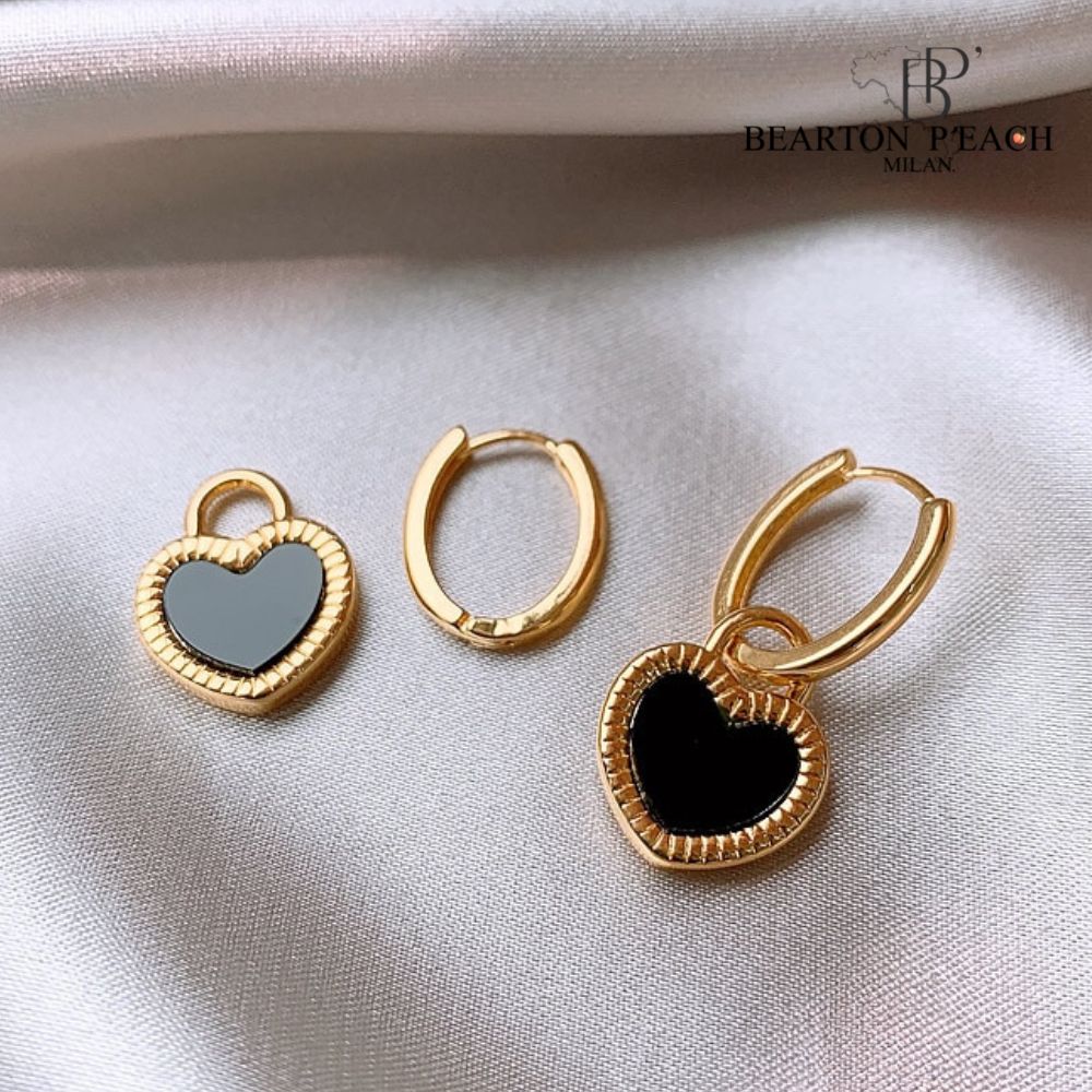 עגיל זהב אלגנט עם תליון לב דו צדדי שחור ולבן בעיצוב איטלקי